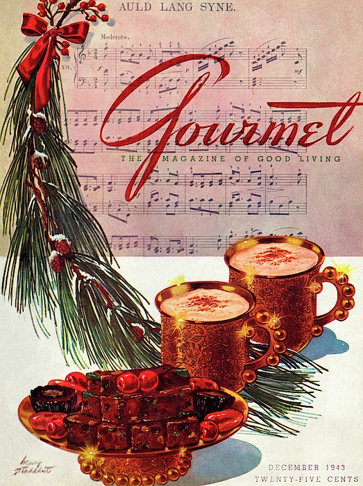 Description: Egg nog, candy and a pine bough on a Gourmet cover.
