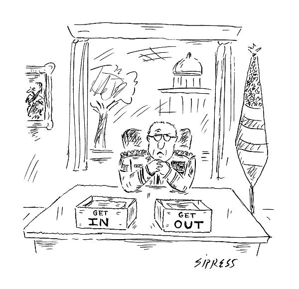 Description: A man dressed in military commander uniform sits at a desk with one box labeled "get in" and the other labeled "get out."