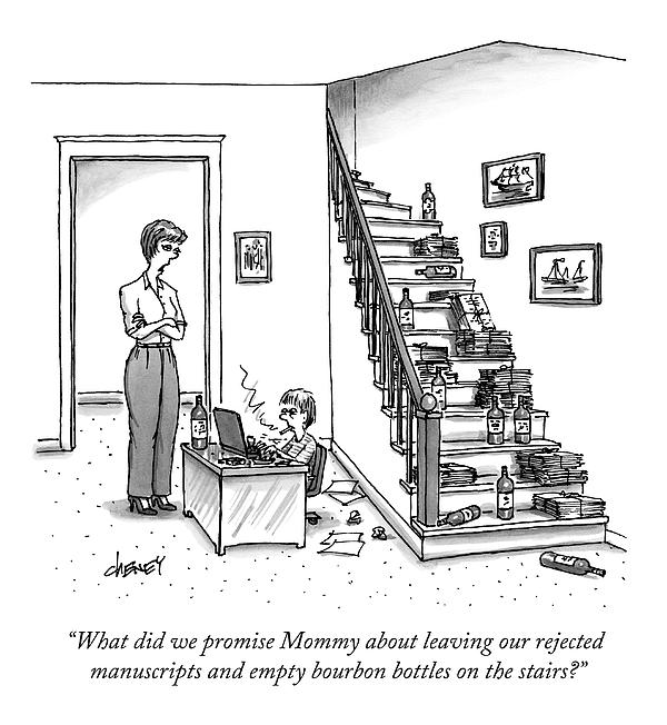 Caption: "What did we promise Mommy about leaving our rejected manuscripts and empty bourbon bottles on the stairs?"
