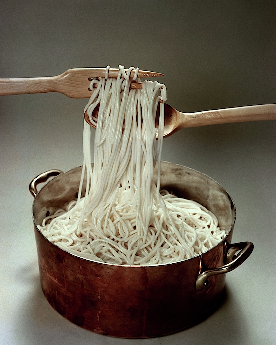 Description: A spoon and fork lifting cooked spaghetti from a pot.