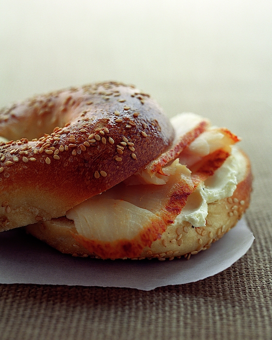 Description: A sesame bagel with sable-fish and cream cheese.
