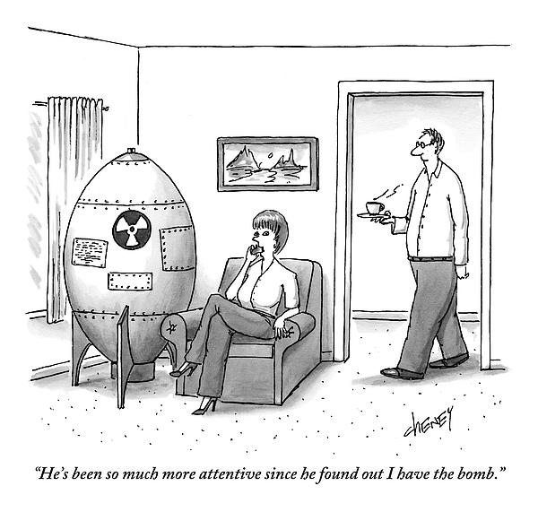 Description: A wife on the phone sits next to a bomb while her husband brings her coffee. "He's been so much more attentive since he found out I have the bomb."