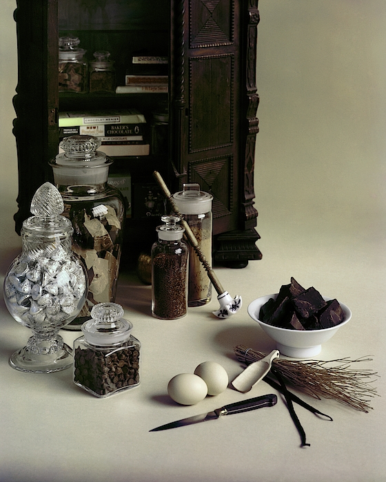 Description: Many different types of chocolate in glass jars near a wooden cabinet.