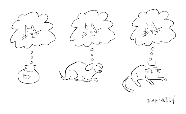 Description: A fish, dog, and cat all thinking about the cat.