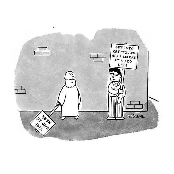 Description: Man on the sidewalk with a traditional The End Is Near signboard is dejected when he sees a man with a signboard about Crypto and N.F.T.s.