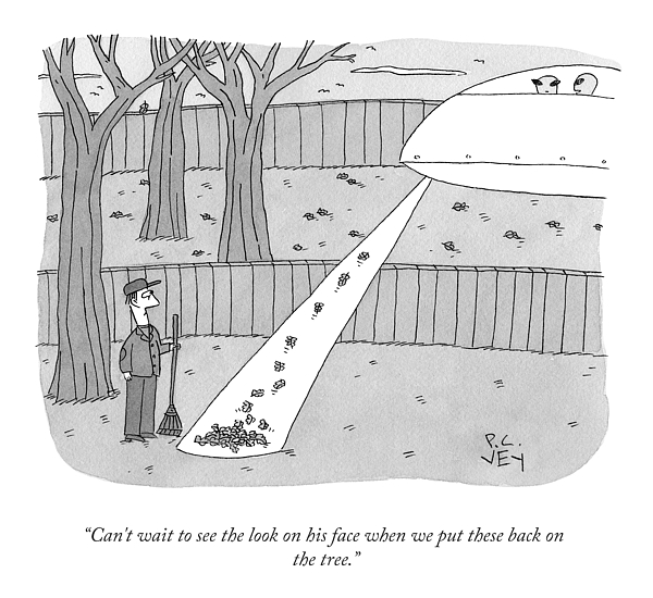 Description: A UFO beams down and collects leaves from a person's yard.