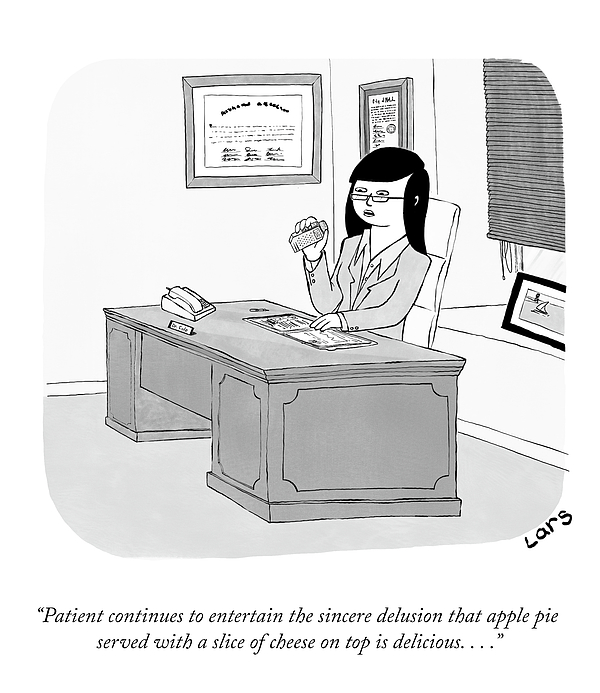 Caption: "Patient continues to entertain the sincere delusion that apple pie served with a slice of cheese on top is delicious. . . ."