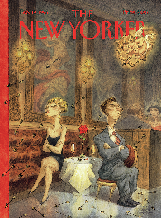 Description: Angry couple at a restaurant not facing each other and cupids arrows are all around them but none of them hitting them.