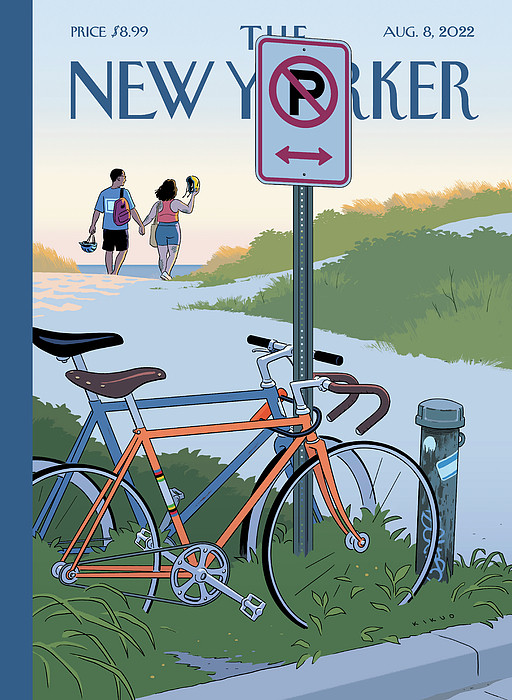 Description: Two bicycles locked to a sign post at the beach, with a couple holding hands and walking on a path towards the sea in the background.