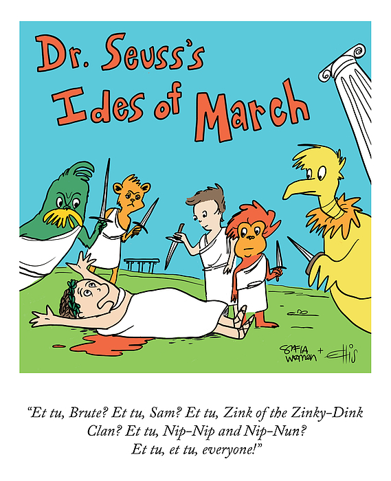 Description: The Ides of March assassination of Julius Caesar enacted by Dr. Seuss characters.
