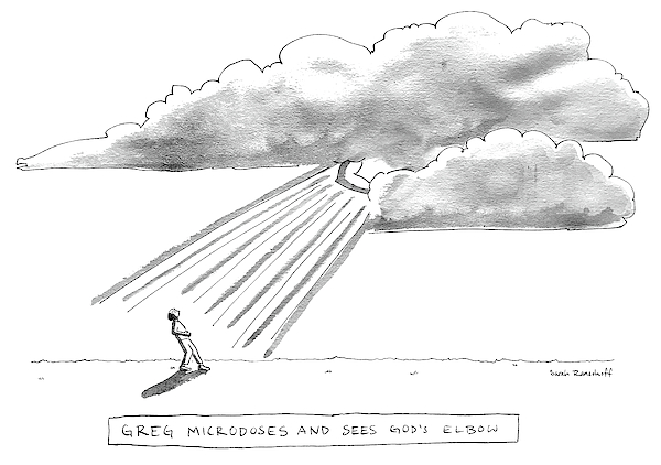 Description: Greg Microdoses And Sees God's Elbow, Man who is only a little high looks up to the sky and sees God's elbow through the clouds.