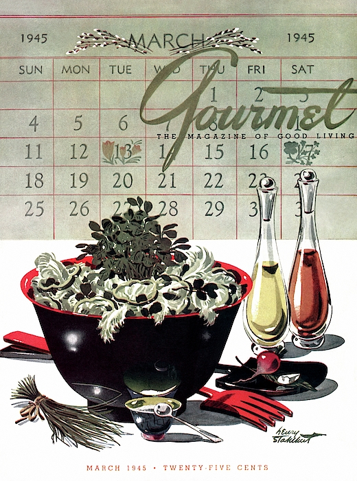 Description: Gourmet cover illustration of a bowl of salad and oil and vinegar decanters with calendar in background