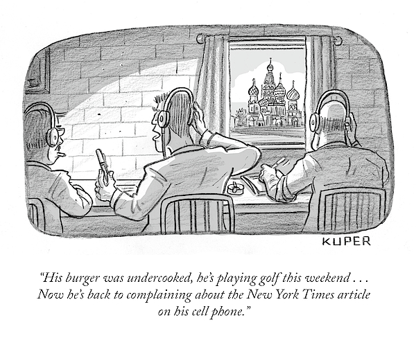 Caption: "His burger was undercooked, he's playing golf this weekend . . . Now he's back to complaining about the New York Times article on his cell phone."