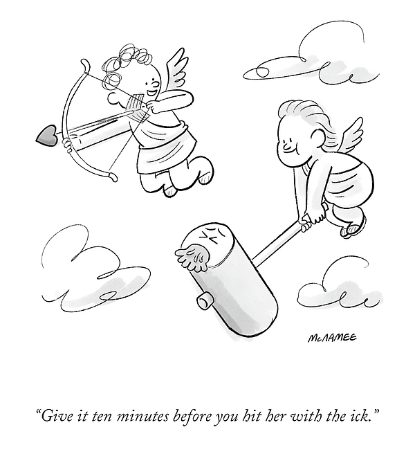 Description: An angel with a bow and heart arrow and another angel with a mallet that has a face being sick on one side, hover in the clouds making a plan.