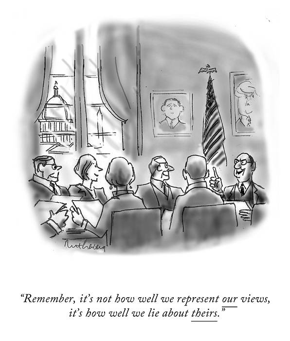 Caption: "Remember, it's not how well we represent our views, it's how well we lie about theirs."