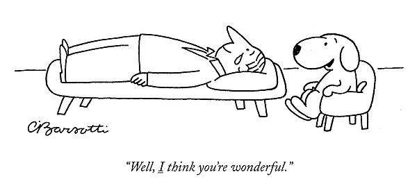 Description: Dog shrink to teary eyed patient on couch.