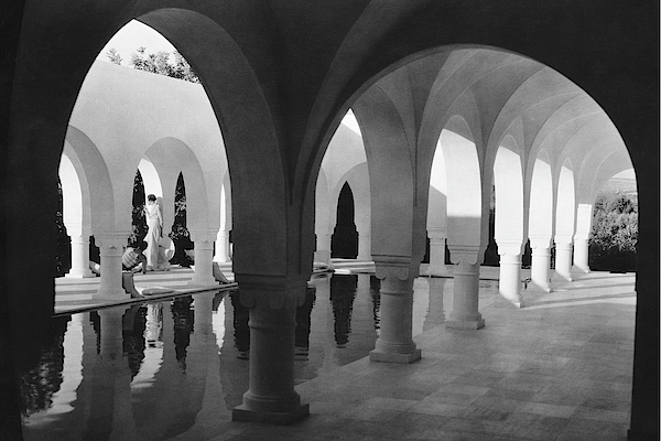 Description: Mr George Sebastian and his wife next to a swimming pool surrounded by columns at Hammamet.