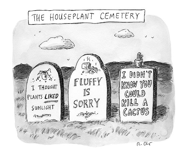 Description: TITLE: The Houseplant Cemetery Three headstones reading "I thought plants liked sunlight." "Fluffy is sorry." "I didn't know you could kill a cactus."