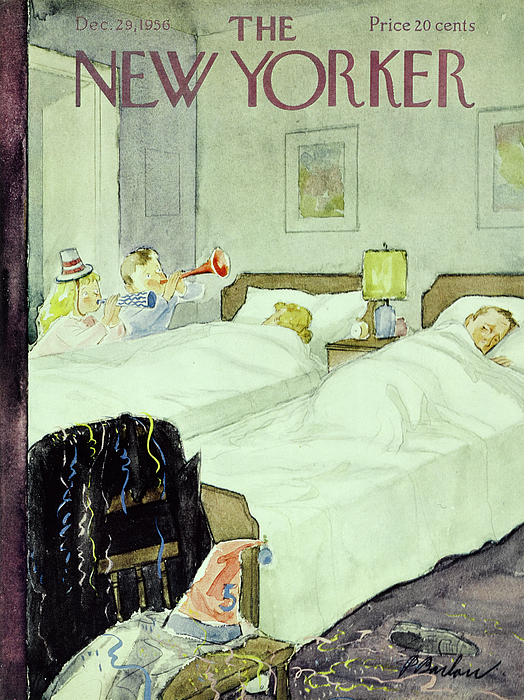 Description: Children blowing horns as their parents lie in bed trying to recover from New Year's Eve.
