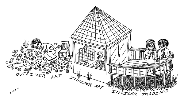 Description: A scene depicting Outsider Art, Insider Art, Insider Trading.