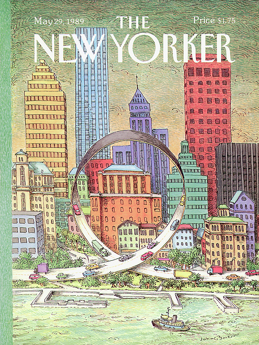 Description: City traffic driving on a river parkway, which loops as if it were a track for toy cars.