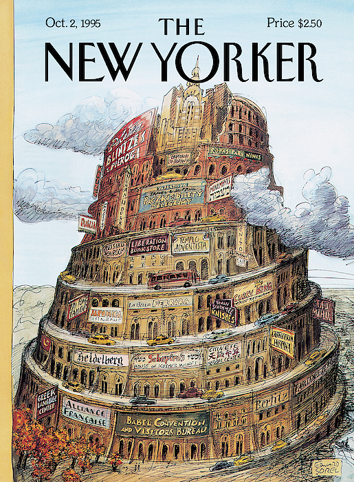 Description: Tower of Babel structure, with facade showing numerous city establishments.