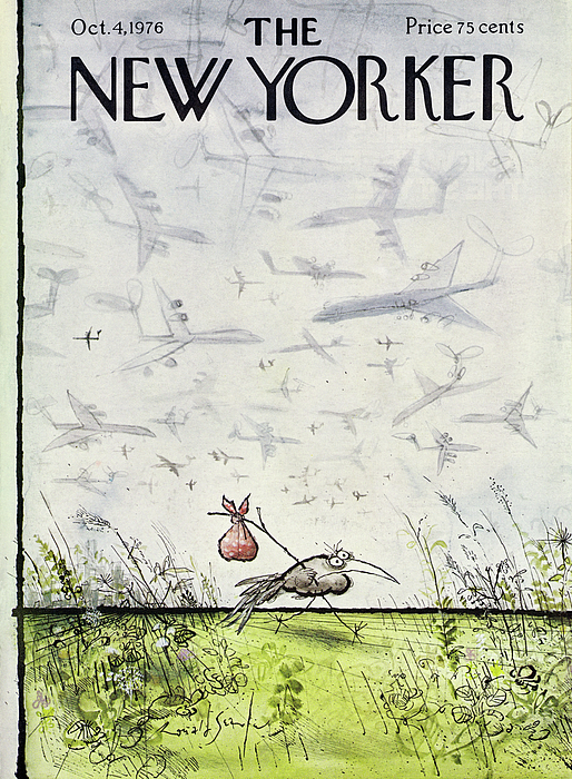 Description: A bird walking with hobo stick and bundle under a sky crowded with airplanes.
