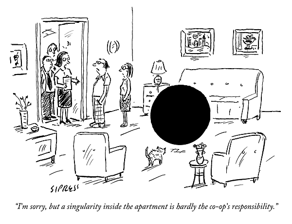 Caption: "I'm sorry, but a singularity inside the apartment is hardly the co-op's responsibility."
