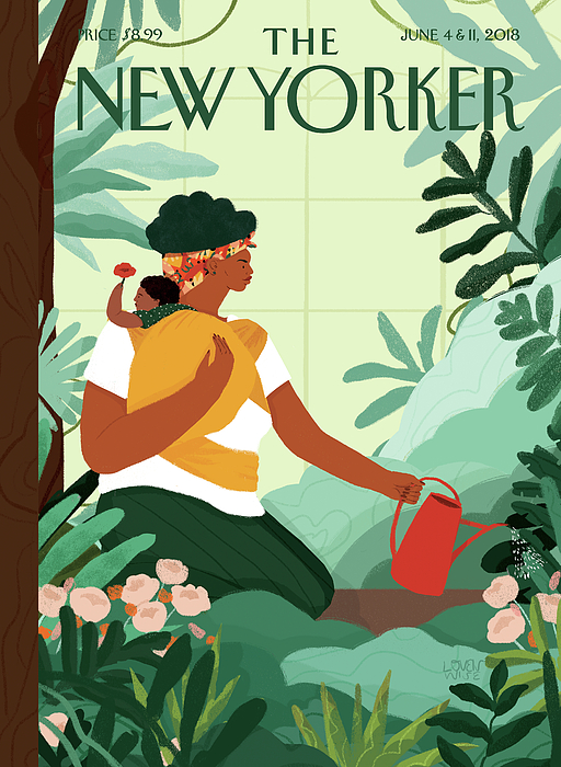 Description: Nurture: Mother holding her baby in a sling, watering a garden in lush forest.