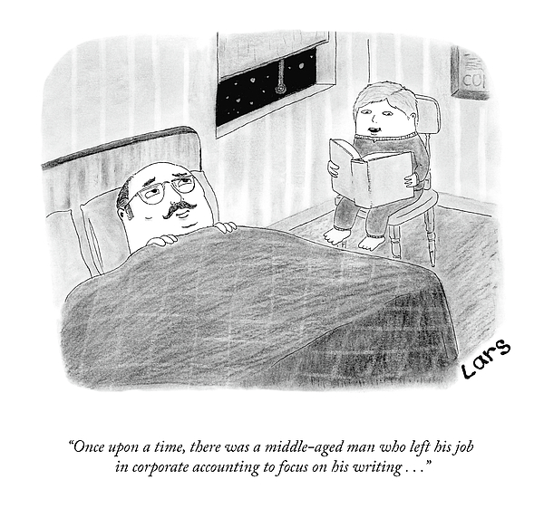 Caption: "Once upon a time, there was a middle-aged man who left his job in corporate accounting to focus on his writing . . ."
