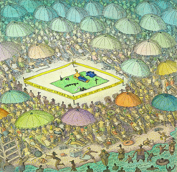 Description: Man on crowed beach has police tape around his blanket.