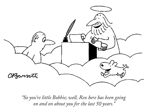 Caption: "So you're little Bobbie; well, Rex here has been going on and on about you for the last 50 years."