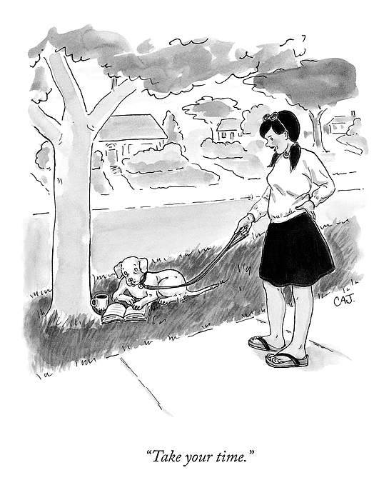 Description: A woman walking dog waits for it as it reads a book and drinks a cup of coffee.