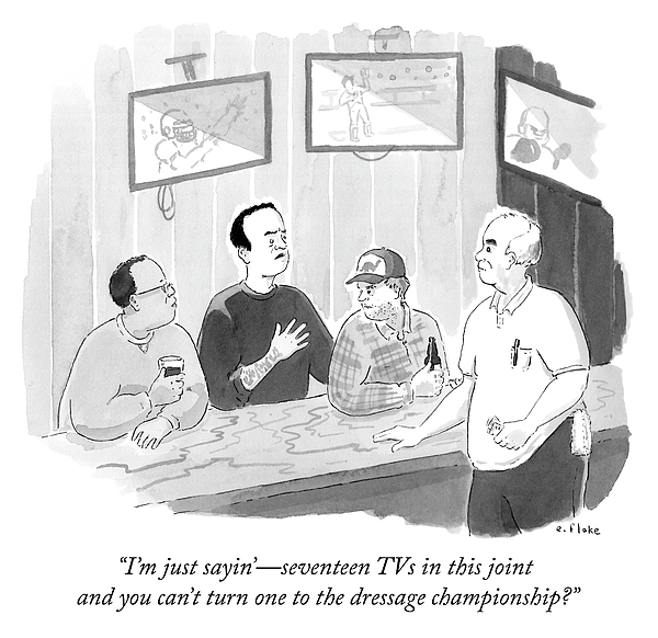 Caption: "I'm just sayin'- seventeen TVs in this joint and you can't turn one to the dressage championship?"