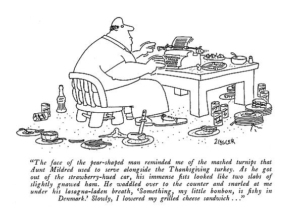 Caption: "The face of the pear-shaped man reminded me of the mashed turnips that Aunt Mildred used to serve alongside the Thanksgiving turkey. As he got out of the strawberry-hued car, his immense fists looked like two slabs of slightly gnawed ham. He waddled