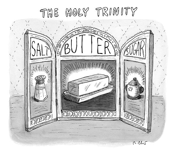 Description: The three panels of a large triptych featuring the Holy Trinity of foods: salt, butter, and sugar.