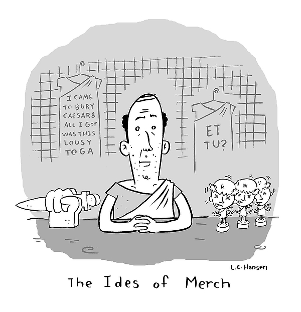 Description: A toga-clad dealer in merchandise commemorating the Ides of March sits behind a store counter.