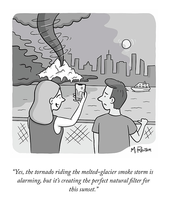 Caption: "Yes, the tornado riding the melted-glacier smoke storm is alarming, but it's creating the perfect natural filter for this sunset."
