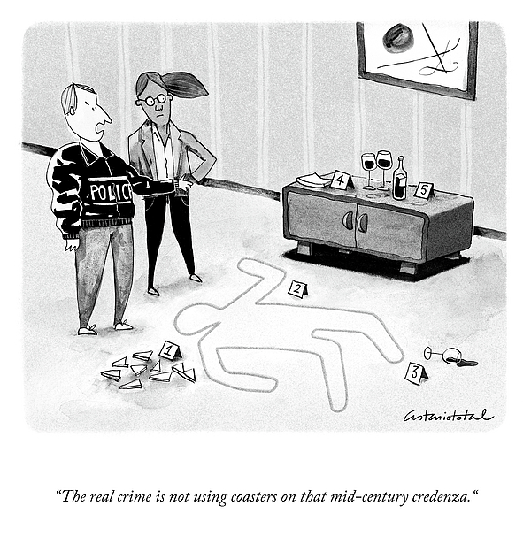 Caption: “The real crime is not using coasters on that mid-century credenza.“