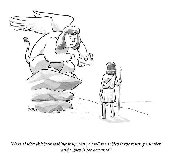 Caption: “Next riddle: Without looking it up, can you tell me which is the routing number and which is the account?”