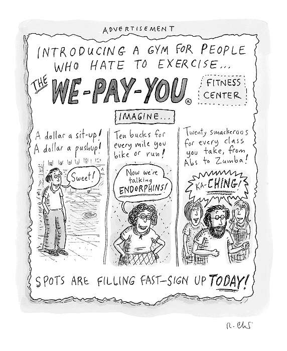 Description: An advertisement introducing A Gym For People Who Hate To Exercise called The We-Pay-You Fitness Center.