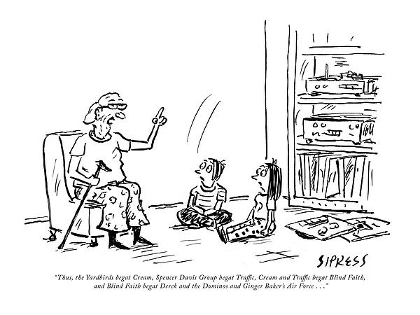 Caption: "Thus, the Yardbirds begat Cream, Spencer Davis Group begat Traffic, Cream and Traffic begat Blind Faith, and Blind Faith begat Derek and the Dominos and Ginger Baker's Air Force . . ."