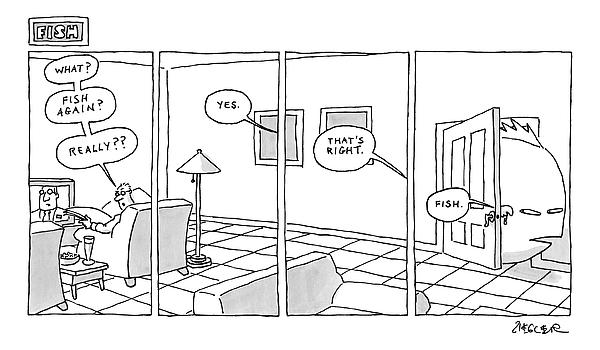 Caption: Title: "Fish." Man sits watching TV and says, "What? Fish again? Really??" as a fish walks through the door.