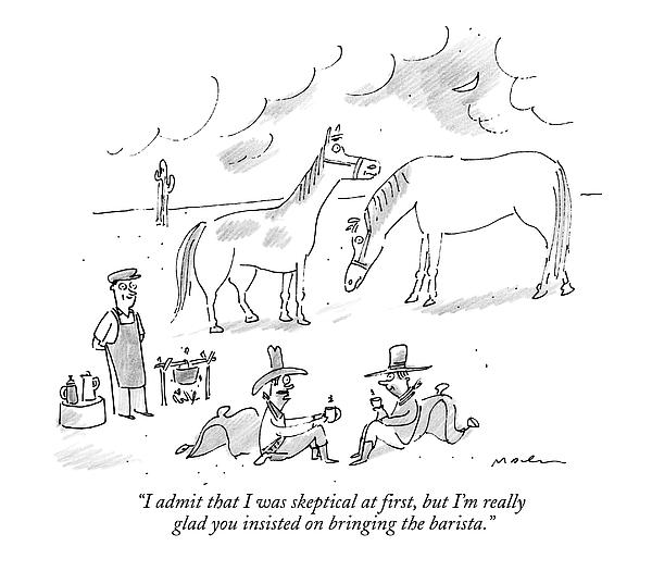 Caption: "I admit that I was skeptical at first, but I'm really glad you insisted on bringing the barista."