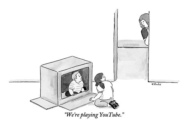 Description: Two kids playing with a cardboard box are speaking with another person.