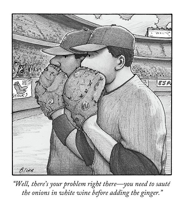 Description: Two baseball players discuss a recipe on the field.